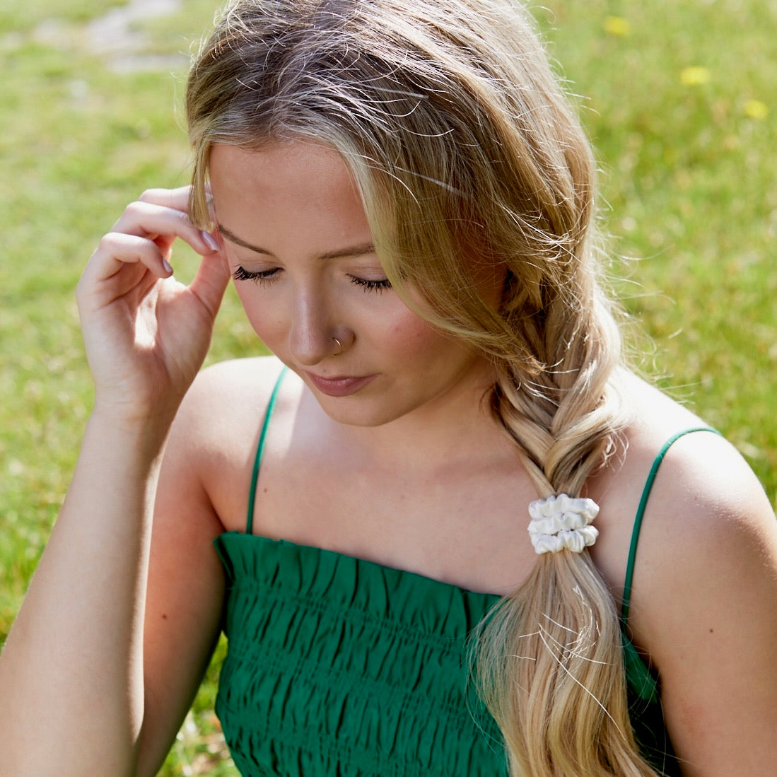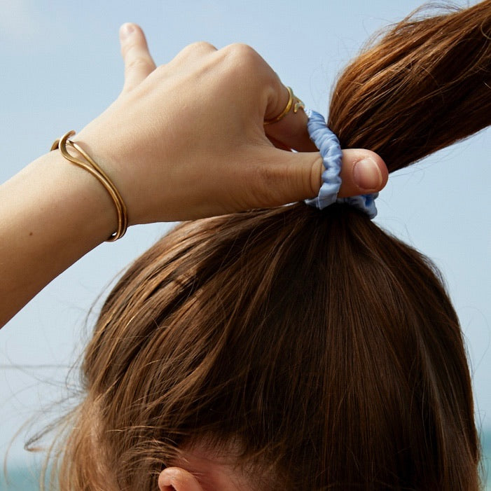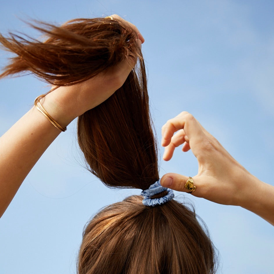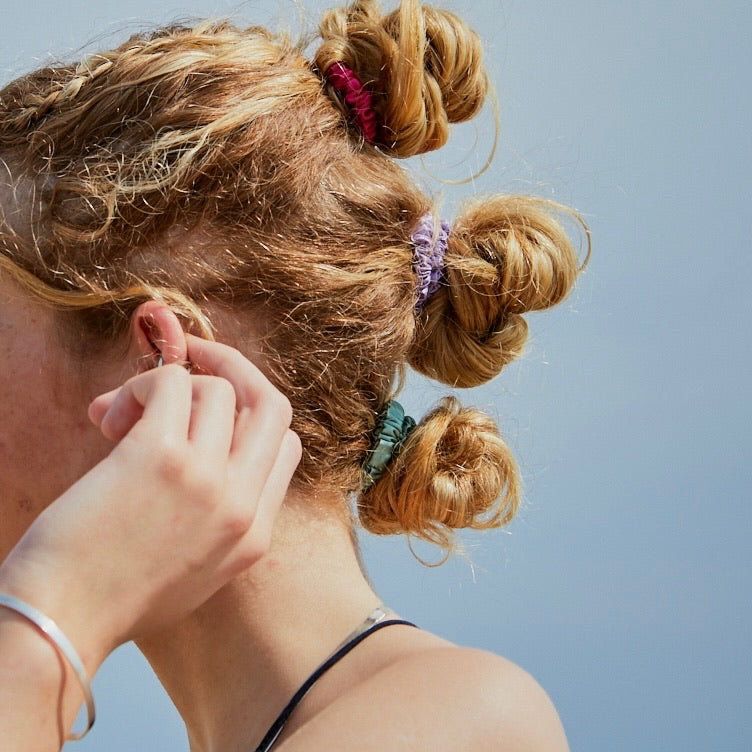 Set of 5 hair ties in smooth and luxurious 22 momme mulberry silk. Made with a strong and supple inner elastic for an unbeatable hold. Suitable for every day use including your workout, and all hair types. A gentle choice for your hair that minimizes damage, kinks, and frizz.